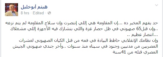 وقال أبو خليل فى تدوينة عبر صفحته على موقع التواصل الاجتماعي"فيس بوك: "حد يفهم المخبر ده …إن المقاومة هي إللي انتصرت وإن سلاح المقاومة لم يتم نزعه ..وإن قتل65 صهيوني في ظل حصار غزة واللي بتشارك فيه الأجهزة إللي مشغلاك …انتصار عظيم".