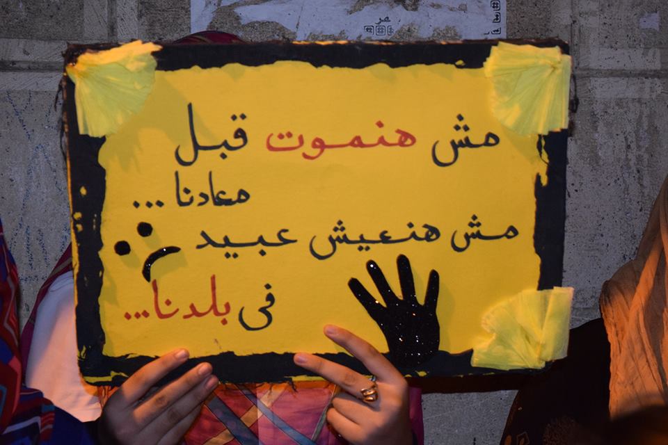 رفعت المشاركات لافتات كتب عليها : "مش هنموت قبل معادنا .. ومش هنعيش عبيد في بلادنا"، كما حملن شارات رابعة، فيما طالبن بالإفراج عن المعتقلات في سجون العسكر، كما نددن بالأوضاع الاقتصادية المتردية.