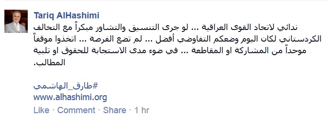 وقال الهاشمي فى تدوينة عبر صفحته على موقع التواصل الاجتماعي "فيس بوك": "ندائي لاتحاد القوى العراقية … لو جرى التنسيق والتشاور مبكرًا مع التحالف الكردستاني لكان اليوم وضعكم التفاوضي أفضل … لم تضع الفرصة … اتخذوا موقفًا موحدًا من المشاركة أو المقاطعة … في ضوء مدى الاستجابة للحقوق أو تلبية المطالب".