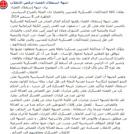 أعلنت جبهة استقلال القضاء رفضها الحكم الجائر الصادر من المحكمة العسكرية بالحبس لمدة عام على كل من : د.صفوت...