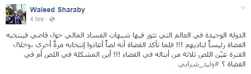 وقال شرابي فى تدوينة عبر صفحته على "فيس بوك":"الدولة الوحيدة في العالم التي تثور فيها شبهات الفساد المالي حول قاضي فينتخبه القضاة رئيساً لناديهم !!! فلما تأكد القضاة أنه لصاً أعادوا انتخابه مرةً أخرى، وخلال الفترة عيَن اللص ثلاثة من أبنائه في القضاء".