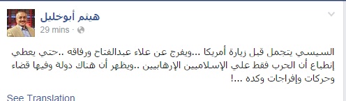 علق الناشط الحقوقي هيثم أبو خليل مدير مركز ضحايا لحقوق الإنسان على قرار الإفراج عن الناشط علاء عبد الفتاح قائلا: "السيسى يتجمل قبل زيارة أمريكا ويفرج عن علاء عبد الفتاح ورفاقه."