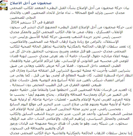أدانت حركة صحفيون من أجل الإصلاح "القتل البطيء الممنهج الذي انتشر في سجون الانقلاب العسكري ، وطال ضمن ما طال الكاتب الصحفي الكبير والمفكر مجدي حسين رئيس تحرير جريدة الشعب ومنسق حركة كفاية الأسبق ورئيس حزب الاستقلال، بالتزامن مع زيادة وتيرة إرهاب الدولة ضد الصحفيين والإعلاميين".