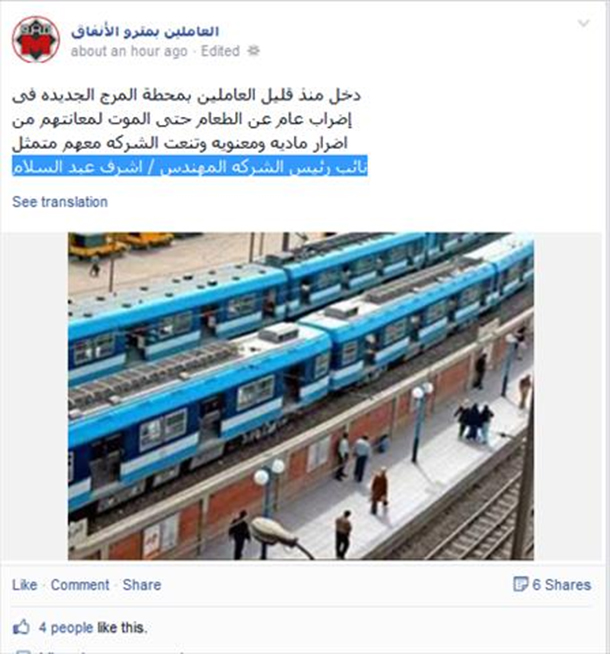 وقال"عبدالسلام" خلال تدوينة له عبر الصفحة الرسمية لجهاز مترو الأنفاق: "دخل منذ قليل العاملين بمحطة مترو المرج الجديدة في إضراب عن الطعام حتى الموت؛ لمعاناتهم من أضرار مادية ومعنوية وتعنت الشركة معهم".