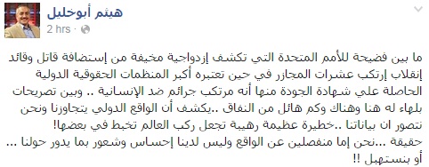 وقال أبو خليل فى تدوينه عبر صفحته على موقع التواصل الاجتماعي "فيس بوك"ما بين فضيحة للأمم المتحدة التي تكشف ازدواجية مخيفة من استضافة قاتل وقائد انقلاب أرتكب عشرات المجازر في حين تعتبره أكبر المنظمات الحقوقية الدولية الحاصلة علي شهادة الجودة منها أنه مرتكب جرائم ضد الإنسانية .. وبين تصريحات بلهاء له هنا وهناك وكم هائل من النفاق ..يكشف أن الواقع الدولي يتجاوزنا ونحن نتصور ان بياناتنا ..خطيرة عظيمة رهيبة تجعل ركب العالم تخبط في بعضها!.