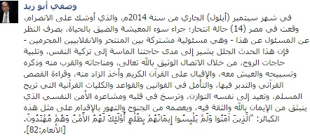وقال أبو زيد فى تدوينة عبر صفحته على "فيس بوك": في شهر سبتمبر (أيلول) الجاري من سنة 2014م، والذي أوشك على الانصرام، وقعت في مصر (14) حالة انتحار؛ جراء سوء المعيشة والضيق بالحياة، بصرف النظر عن المسئول عن هذا – وهي مسئولية مشتركة بين المنتحر والانقلابيين المجرمين – فإن هذا الحدث الجلل يشير إلى مدى حاجتنا الماسة إلى تزكية النفس، وتلبية حاجات الروح، من خلال الاتصال الوثيق بالله تعالى، ومناجاته والقرب منه وذكره وتسبيحه والعيش معه، والإقبال على القرآن الكريم وأخذ الزاد منه، وقراءة القصص القرآني والتدبر فيها، والتأمل في القوانين والقواعد والكليات القرآنية التي تريح المسلم، وتعيد إلى نفسه التوازن، وترسخ في قلبه ومشاعره الأمن النفسي الذي ينبثق من الإيمان بالله والثقة فيه، ويعصمه من الجنوح والتهور بالإقدام على مثل هذه الكبائر: "الَّذِينَ آمَنُوا وَلَمْ يَلْبِسُوا إِيمَانَهُمْ بِظُلْمٍ أُوْلَئِكَ لَهُمُ الأَمْنُ وَهُمْ مُهْتَدُونَ. [الأنعام:82].