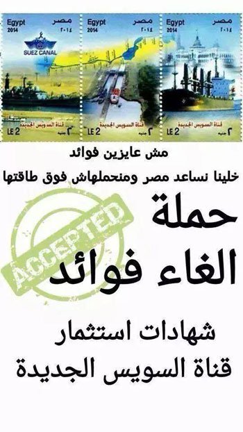 تصاعدت أصداء حملة لأنصار الانقلاب تطالب بإلغاء فوائد شهادات استثمار قناة السويس الجديدة، على مواقع التواصل الاجتماعي فيس بوك وتويتر؛ تعبيرًا عن حبهم  لقائد الانقلاب، عبدالفتاح السيسي، وتضامنًا مع الوضع الاقتصادي الذي يمر به الوطن.