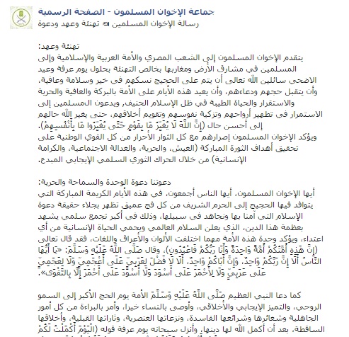 يتقدم الإخوان المسلمون إلى الشعب المصري والأمة العربية والإسلامية وإلى المسلمين في مشارق الأرض ومغاربها بخالص التهنئة بحلول يوم عرفة وعيد الأضحى، سائلين الله تعالى أن يتم على الحجيج نسكهم في خير وسلامة وعافية، وأن يتقبل حجهم ودعاءهم، وأن يعيد هذه الأيام على الأمة بالبركة والعافية والحرية والاستقرار والحياة الطيبة في ظل الإسلام الحنيف.