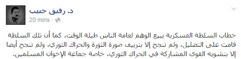 وأضاف حبيب فى تدوينة عبر صفحته على موقع التواصل الاجتماعي "فيس بوك": أن السلطة لم  تنجح إلا بتزييف صورة الثورة والحراك الثوري، ولم تنجح أيضا إلا بتشويه القوى المشاركة في الحراك الثوري، خاصة جماعة الإخوان المسلمين."