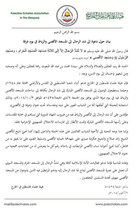 دعت هيئة علماء فلسطين في الخارج، أبناء الشعب الفلسطيني في القدس والأراضي المحتلة عام 1948م وحيثما يستطيعون الوصول إلى المسجد الأقصى المبارك إلى شد الرحال بكثافة إلى ساحات المسجد الأقصى والرباط فيه في يوم عرفة الذي يوافق يوم الجمعة 9/ذي الحجة/1435هـ الموافق 3/10/2014م، وذلك استجابة للحملة التي أطلقها ثلة من الشباب الغيور على دينه ومقدساته تحت عنوان (عرفة في الأقصى).