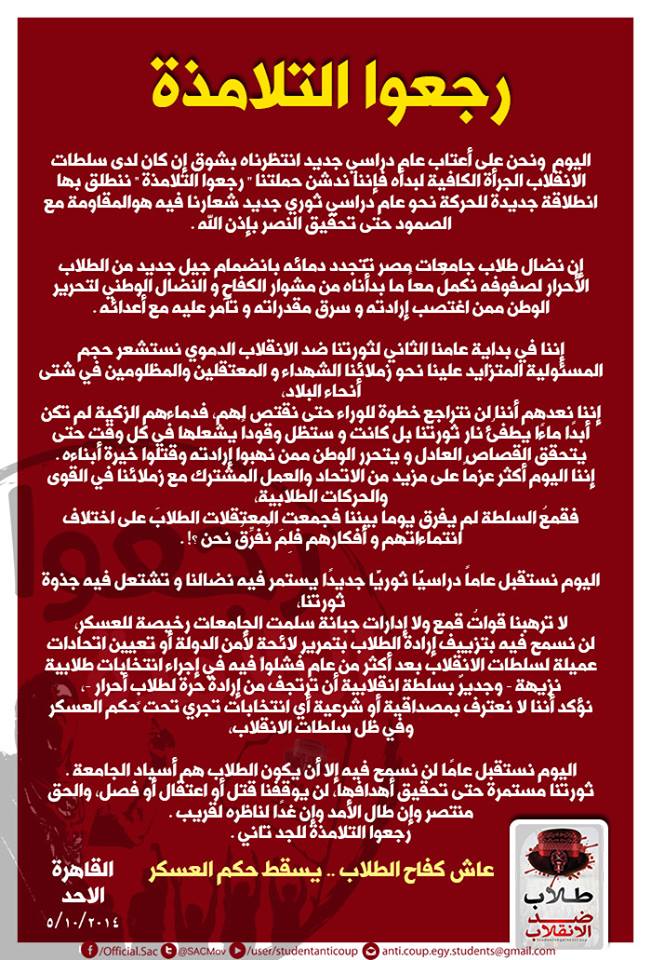 أصدرت حركة "طلاب ضد الانقلاب"، بيانًا بعنوان "رجعوا التلامذة"، مع بداية العام الدراسي الجديد، وأضافت الحركة أن الحملة جاءت كإنطلاقة جديدة للحركة نحو عام دراسي ثوري جديد، كما أشارت أن عنوان الحركة بهذا العام هوالمقاومة مع الصمود حتى تحقيق النصر بإذن الله .