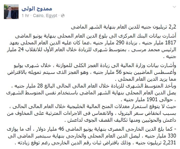 ووأوضح الولى أنه "بأخذ المتوسط الشهري للزيادة خلال العام المالي الحالي البالغ 28 مليار جنيه ، يصل الدين العام المحلى بنهاية الشهر الماضي باستخدام نفس المتوسط الشهرى ، حوالي 1901 مليار جنيه، حيث لا يتوقع استمرار معدلات المنح المالية الخليجية خلال العام المالي الحالي ، بسبب انخفاض سعر البترول ، والانغماس فى الإجراءات المترتبة على المخاوف من داعش والحوثيين ، ومنها تكاليف القصف الجوى لداعش".