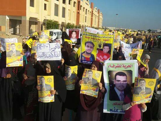 وﺷﻬﺪﺕ ﺍﻟﻤﺴﻴﺮﺓ ﺍﻟﺘﻲ ﺍﻧﻄﻠﻘﺖ ﻣﻦ ﺃﻣﺎﻡ ﺍﻟﺴﻮﻕ ﺍﻟﺪﻭﻟﻲ ﺑﻤﺪﻳﻨﺔ ﺍﻟﺼﺎﻟﺤﻴﺔ ﺍﻟﺠﺪﻳﺪﺓ ﻣﺸﺎﺭﻛﺔ ﻭاسعة ﻭتفاعلا ﻛﺒﻴﺮًﺍ ﻣﻦ ﺍلأﻫﺎلي، ﻭﺃﺳﺮ ﻭﺃﺑﻨﺎﺀ ﺍﻟﻤﻌﺘﻘﻠﻴﻦ ﻭﺍﻟﺸﻬﺪﺍﺀ، ﻣﺮﺩﺩﻳﻦ ﺍﻟﻬﺘﺎﻓﺎﺕ ﻭﺍﻟﺸﻌﺎﺭﺍﺕ ﺍﻟﻤﻨﺎهضة ﻟﺤﻜﻢ ﺍﻟﻌﺴﻜﺮ، ﺭﺍﻓﻌﻴﻦ ﺻﻮﺭ ﺍﻟﺸﻬﺪﺍﺀ، ﻭﺍﻟﻤﻌﺘﻘﻠﻴﻦ، ﻭﺷﺎﺭﺍﺕ ﺭﺍﺑﻌﺔ ﺍﻟﻌﺪﻭية، ﻭﺃﻋﻼﻡ ﻣﺼﺮ، ﻭﺻﻮﺭ ﺍﻟﺮﺋﻴﺲ ﻣﺮﺳﻰ ﺗﺤﻴﺔ ﻟﺼﻤﻮﺩﻩ ﺩﺍﺧﻞ ﺳﺠﻮﻥ ﺍﻻﻧﻘﻼﺏ.