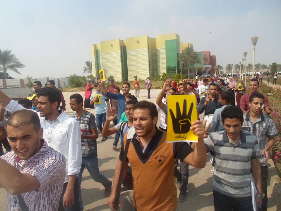 نظمت حركة "طلاب ضد الانقلاب" بكلية هندسة العاشر من رمضان، مسيرة حاشدة داخل الحرم الجامعي، رغم التواجد الأمني المكثف، حيث ردد المشاركون هتافات تطالب بالإفراج عن زملائهم المعتقليين، كما طالبوا بالقصاص لدماء الشهداء.
