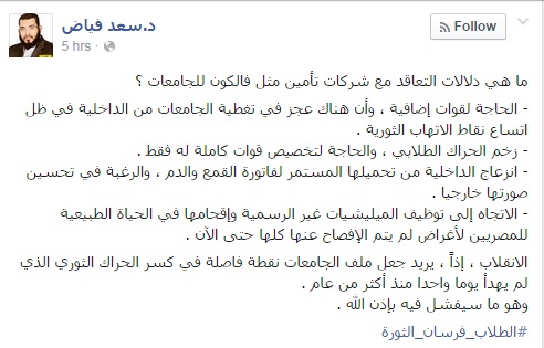 وذكر فياص عبر صفحته على موقع التواصل الاجتماعي" فيس بوك": أن دلالات التعاقد تشير إلى "الاتجاه إلى توظيف المليشيات غير الرسمية وإقحامها في الحياة الطبيعية للمصريين لأغراض لم يتم الإفصاح عنها كلها حتى الآن"، لافتًا إلى أن الانقلاب يريد "جعل ملف الجامعات نقطة فاصلة في كسر الحراك الثوري الذي لم يهدأ يومًا واحدًا منذ أكثر من عام".