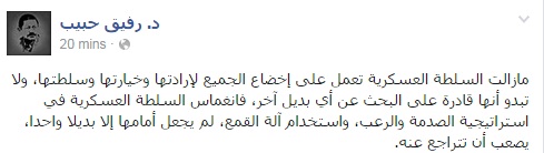 وأضاف حبيب فى تدوينة عبر صفحته على موقع التواصل الاجتماعي "فبس بوك " أن "انغماس السلطة العسكرية في إستراتيجية الصدمة والرعب، واستخدام آلة القمع، لم يجعل أمامها إلا بديلا واحدا، يصعب أن تتراجع عنه".