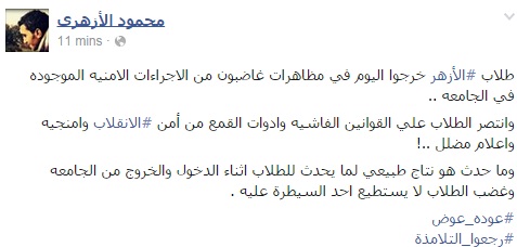 قال محمود الأزهري المتحدث الرسمي لحركة طلاب ضد الانقلاب بالأزهر إن "طلاب الأزهر خرجوا اليوم في مظاهرات غاضبون من الإجراءات الأمنية الموجودة في الجامعة".