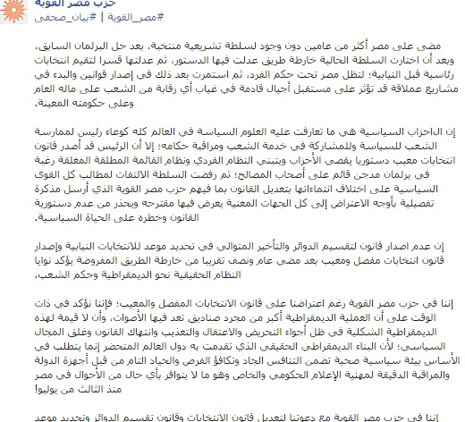 وأضاف الحزب إن الأحزاب السياسية هي ما تعارفت عليه العلوم السياسة في العالم كله كوعاء رئيس لممارسة الشعب للسياسة وللمشاركة في خدمة الشعب ومراقبة حكامه؛ إلا أن الرئيس قد أصدر قانون انتخابات معيب دستوريا يقصي الأحزاب ويتبني النظام الفردي ونظام القائمة المطلقة المغلقة رغبة في برلمان مدجن قائم على أصحاب المصالح؛ ثم رفضت السلطة الالتفات لمطالب كل القوى السياسية على اختلاف انتماءاتها بتعديل القانون بما فيهم حزب مصر القوية الذي أرسل مذكرة تفصيلية بأوجه الاعتراض إلى كل الجهات المعنية يعرض فيها مقترحه ويحذر من عدم دستورية القانون وخطره على الحياة السياسية.