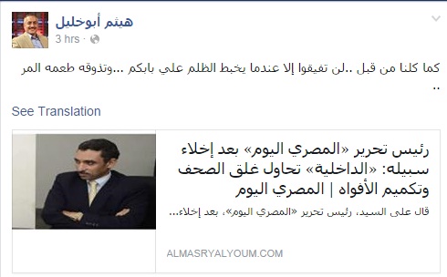 علق الحقوقي هيثم أبو خليل مدير مركز ضحايا لحقوق الإنسان، على تصريح رئيس تحرير المصري اليوم والتى قال فيها إن داخلية الانقلاب تريد تكميم الأفواه وغلق الصحف بقوله" لن تفيقوا إلا عندما يخبط الظلم على بابكم".
