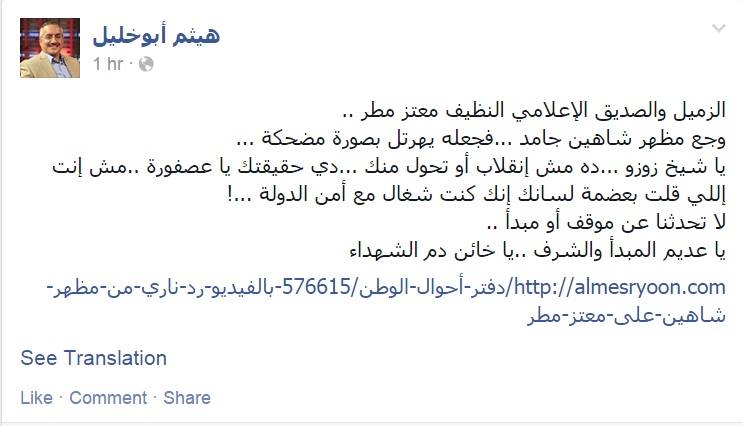 هاجم هيثم أبو خليل، الناشط الحقوقي، ومدير مركز ضحايا لحقوق الإنسان، الشيخ مظهر شاهين، إمام وخطيب مسجد عمر مكرم قائلا: "لا تحدثنا عن موقف أو مبدأ .. يا عديم المبدأ والشرف ..يا خائن دم الشهداء".
