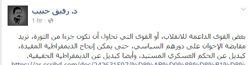 وقال حبيب في تدوينة عبر صفحته على موقع التواصل الاجتماعي "فيس بوك": "بعض القوى الداعمة للانقلاب، أو القوى التي تحاول أن تكون جزءًا من الثورة، تريد مقايضة الإخوان على دورهم السياسي".