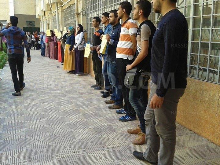 نظمت حركة طلاب ضد الانقلاب بجامعة دمياط، صباح اليوم الاثنين، وقفة داخل كلية تجارة، تحولت إلى مسيرة حاشدة جابت أرجاء الكلية، حمل فيها المشاركون لافتات لمعتقلي الكلية وشهيد الكلية عمر بركات.