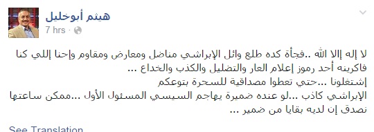 وأضاف أبوخليل في تدوينة عبر صفحته على موقع التواصل الاجتماعي "فيس بوك": "لا إله إلا الله.. فجأة كده طلع وائل الإبراشي مناضل ومعارض ومقاوم، وإحنا إللي كنا فاكرينه أحد رموز إعلام العار والتضليل والكذب والخداع".