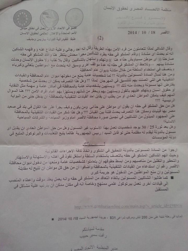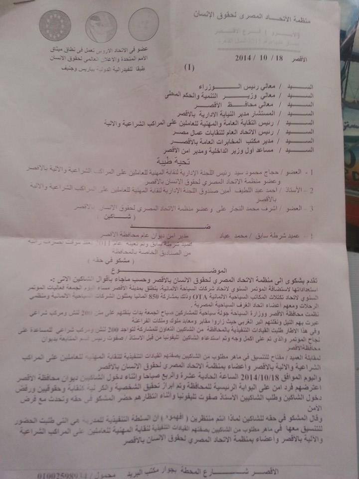 قدّم كل من المواطن "حجاج محمود سيد"، رئيس اللجنة الإدارية للنقابة المهنية للعاملين على المراكب الشراعية والآلية بالأقصر، و"أحمد عبد اللطيف"، أمين صندوق اللجنة الإدارية للنقابة المهنية للعاملين على المراكب الشراعية والآلية بالأقصر، و"أشرف محمد النجار على" – عضو منظمة الاتحاد المصري لحقوق الإنسان – بشكوى إلى منظمة الاتحاد المصري لحقوق الإنسان بالأقصر، يتهمون فيها "محمد عياد" – مدير أمن ديوان عام محافظة الأقصر وعميد شرطة سابق – بالتعسف في استخدام السلطة واستغلال نفوذه في الإهانة والاستهانة والاستهتار والتحقير والتقليل من مناصبهم، ومن منعهم من دخول ديوان محافظة الأقصر، رغم أنه تم استدعاؤهم من القيادات التنفيذية بالمحافظة.