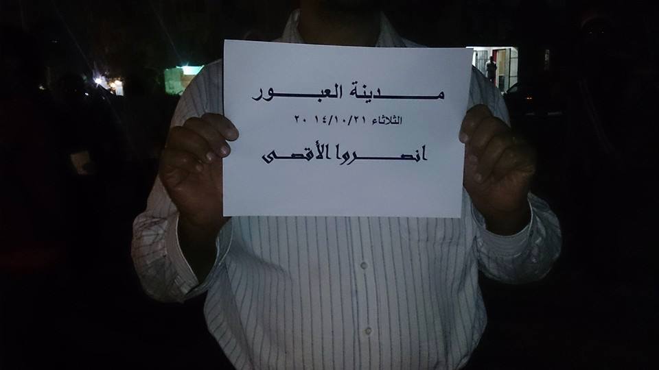 وعلى صعيد آخر، خرجت تظاهرة من أمام سوق مدينة العبور التجاري بحي الشباب، نددوا فيها بالاعتداءات التي يقوم بها المستوطنون الصهاينة وتدنيسهم للمسجد الأقصى المبارك.