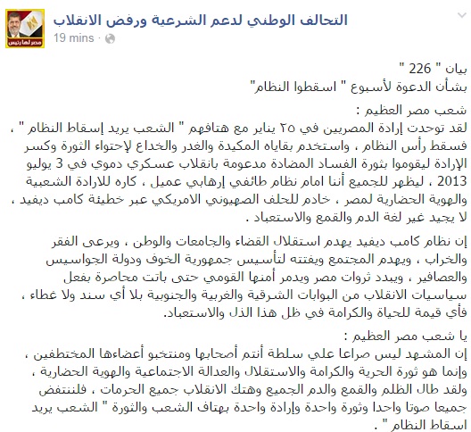 وتابع البيان: "يا شعب مصر العظيم لقد توحدت إرادة المصريين في ٢٥ يناير مع هتافهم "الشعب يريد إسقاط النظام"، فسقط رأس النظام، واستخدم بقاياه المكيدة والغدر والخداع لاحتواء الثورة وكسر الإرادة ليقوموا بثورة الفساد المضادة مدعومة بانقلاب عسكري دموي في 3 يوليو 2013، ليظهر للجميع أننا امام نظام طائفي إرهابي عميل، كاره للإرادة الشعبية والهوية الحضارية لمصر، خادم للحلف الصهيوني الأمريكي عبر خطيئة كامب ديفيد، لا يجيد غير لغة الدم والقمع والاستعباد".