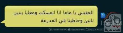 نشر "مرصد طلاب حرية" نسخة من آخر رسالة أرسلتها الطالبة "علياء طارق السيد" – الطالبة بالفرقة الأولى في كلية الشريعة والقانون جامعة الأزهر فرع القاهرة، والمختطفة من قبل قوات أمن الانقلاب – إلى والدتها لحظة إلقاء القبض عليها.