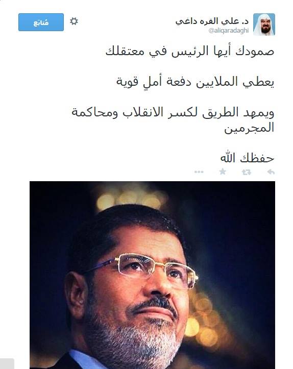 ثمن الدكتور علي القرة داغي، الأمين العام للاتحاد العالمي لعلماء المسلمين، صمود الرئيس محمد مرسي، وثباته على موقفه الرافض للانقلاب، وتحمله للاعتقال والسجن.