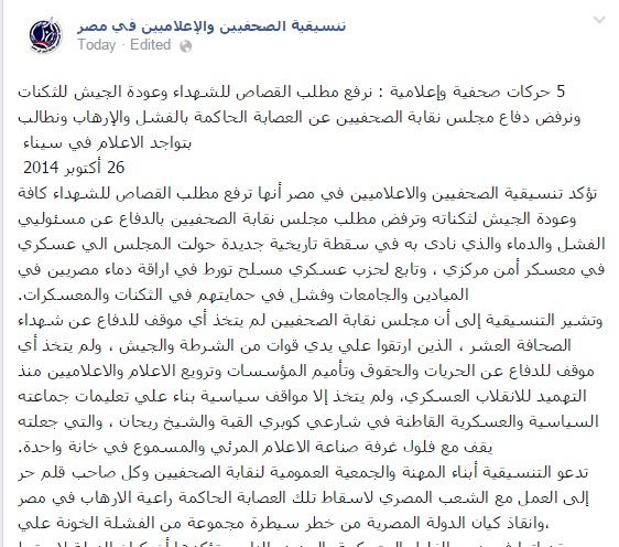 أكدت تنسيقية الصحفيين والإعلاميين في مصر، أنها ترفع مطلب القصاص للشهداء كافة وعودة الجيش لثكناته، وترفض مطلب مجلس نقابة الصحفيين "بالدفاع عن مسئوليي الفشل والدماء والذي نادى به في سقطة تاريخية جديدة حولت المجلس الي عسكري في معسكر أمن مركزي ، وتابع لحزب عسكري مسلح تورط في اراقة دماء مصريين في الميادين والجامعات وفشل في حمايتهم في الثكنات والمعسكرات".
