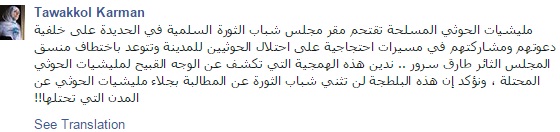 وقالت كرمان في تدوينة عبر صفحتها على موقع التواصل الاجتماعي "فيس بوك": إن "مليشيات الحوثي المسلحة تقتحم مقر مجلس شباب الثورة السلمية في الحديدة، على خلفية دعوتهم ومشاركتهم في مسيرات احتجاجية على احتلال الحوثيين للمدينة، وتتوعد باختطاف منسق المجلس الثائر طارق سرور".