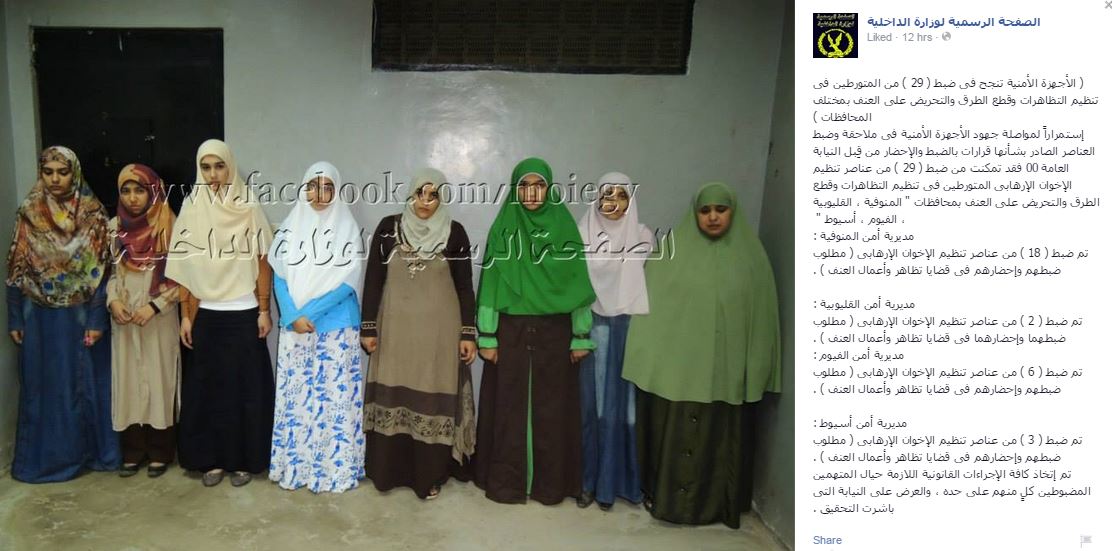 نشرت الصفحة الرسمية لوزارة داخلية الانقلاب، اليوم الأحد، خبرًا مفاده القبض على مجموعة من المتهمات المنتميات لجماعة إرهابية (بحسب البيان)، متهمات بالتحريض على العنف وقطع الطرق بمختلف المحافظات، وهي تهم تصل عقوبتها للإعدام، وأرفقت صورة في الخبر لبعض الفتيات في عمر الزهور، وسيدة منزل، على أنهن المتهمين الرئيسين في القضية.
