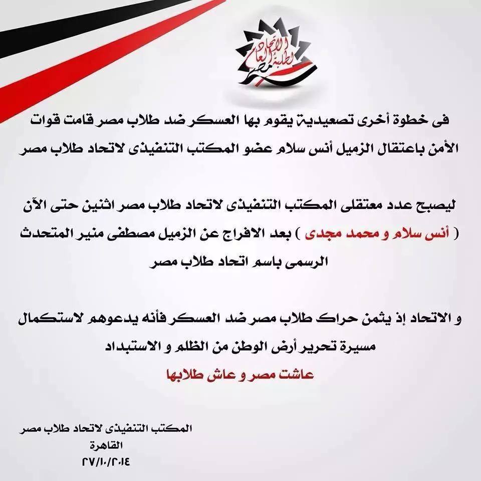 حيث قال في منشور له على موقع التواصل الاجتماعي "فيس بوك": "فى خطوة أخرى تصعيدية يقوم بها العسكر ضد طلاب مصر، قامت قوات الأمن باعتقال الزميل أنس سلام – عضو المكتب التنفيذى لاتحاد طلاب مصر – ليصبح عدد معتقلي المكتب التنفيذي لاتحاد طلاب مصر اثنين (أنس سلام، ومحمد مجدى)، بعد الإفراج عن الزميل مصطفى منير – المتحدث الرسمى باسم اتحاد طلاب مصر".