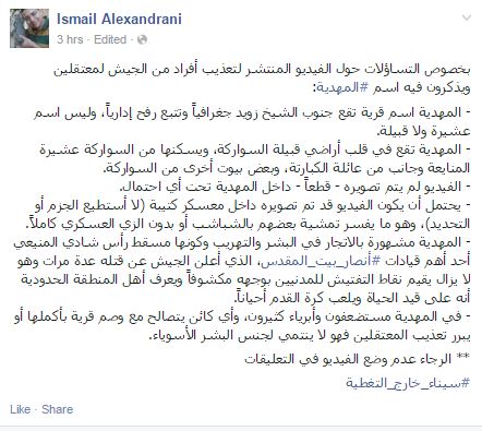 وقال الإسكندراني – على حسابة الشخصي على موقع فيس بك – بعد توارد تساؤلات بكثرة له حول تفاصيل تلك الجريمة، خصوصًا التساؤلات حول الفيديو المنتشر لتعذيب أفراد من الجيش (الانقلابي) لمعتقلين ويذكرون فيه اسم المهدية: