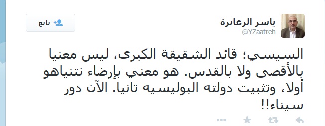 وقال الزعاترة في تدوينه عبر صفحته على موقع التواصل الاجتماعي "تويتر": "السيسي؛ قائد الشقيقة الكبرى، ليس معنيًا بالأقصى ولا بالقدس، هو معني بإرضاء نتنياهو أولًا، وتثبيت دولته البوليسية ثانيًا، الآن دور سيناء!".