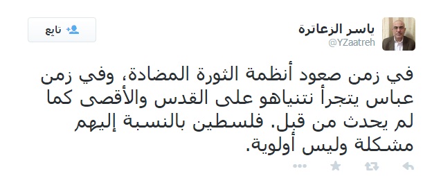 وأضاف: "في زمن صعود أنظمة الثورة المضادة، وفي زمن عباس يتجرأ نتنياهو على القدس والأقصى، كما لم يحدث من قبل، فلسطين بالنسبة إليهم مشكلة وليس أولوية."