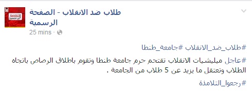 اقتحمت قوات أمن الانقلاب جامعة طنطا، منذ قليل، وقامت بإطلاق الرصاص باتجاه الطلاب، لفض تظاهرة طلابية...