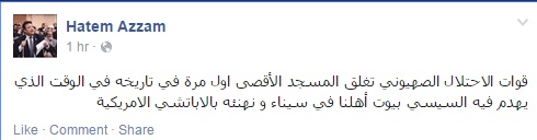 وقال عزام في تدوينة عبر صفحته على موقع التواصل الاجتماعي "فيس بوك": "قوات الاحتلال الصهيوني تغلق المسجد الأقصى أول مرة في تاريخه، في الوقت الذي يهدم فيه السيسي بيوت أهلنا في سيناء، ونهنئه بالأباتشي الأمريكية".
