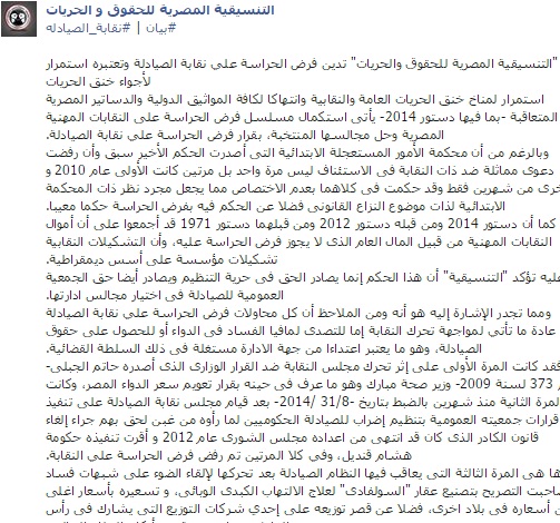وقالت التنسيقية في بيان عبر الصفحة الرسمية على موقع التواصل الاجتماعي "فيس بوك": "إن استمرار لمناخ خنق الحريات العامة والنقابية وانتهاكا لكافة المواثيق الدولية والدساتير المصرية المتعاقبة -بما فيها دستور 2014- يأتي استكمال مسلسل فرض الحراسة على النقابات المهنية المصرية وحل مجالسها المنتخبة، بقرار فرض الحراسة علي نقابة الصيادلة".