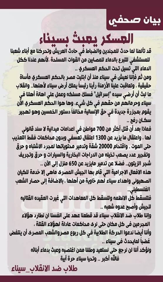 أصدرت حركة "طلاب ضد الانقلاب" في سيناء، بيانًا، بعنوان "العسكر يعبث بسيناء"، تنعي فيه الشهداء الذين وقعوا في حادث العريش، الأسبوع الماضي، مؤكدةً تألمها لمقتلهم، ومسارعة أعضاء الحركة للتبرع بالدم للمصابين.