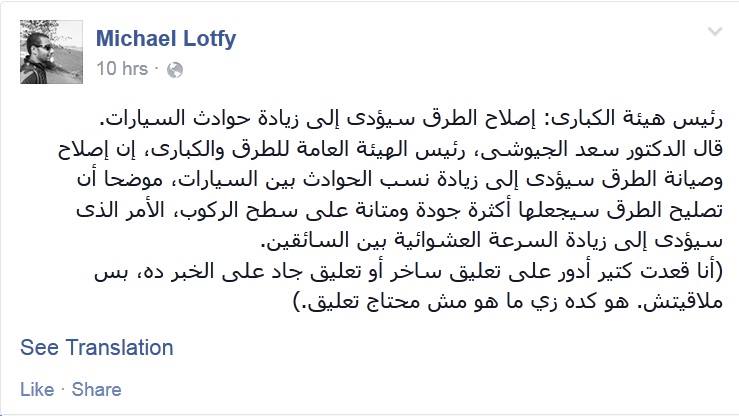 وقال الناشط السياسي، وائل عباس، في تدوينة عبر صفحته على موقع التواصل الاجتماعي "فيس بوك": "رئيس الدولة يقولك الإخوان وصلوا للحكم بالديمقراطية ورئيس الطرق والكباري يقولك لو سفلتنا الشوارع الحوادث ها تزيد! هو ده المنطق في مصر حاليا !!!".