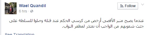 وقال قنديل في تدوينة عبر صفحته على موقع التواصل الاجتماعي "فيس بوك": "عندما يصبح منبر الأقصى أرخص من كرسي الحكم، عند قتلة وصلوا للسلطة على جثث شعوبهم، من الواجب أن نعتذر لمظفر النواب".