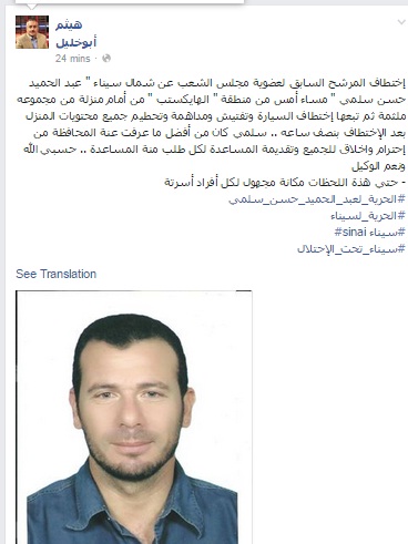 وقال أبو خليل في تدوينة عبر صفحته على موقع التواصل الاجتماعي "فيس بوك": "اختطاف عبدالحميد حسن سلمي، المرشح السابق لعضوية مجلس الشعب عن شمال سيناء، مساء أمس من منطقة "الهايكستب"، من أمام منزله، من قبل مجموعة ملثمة، تبعها اختطاف السيارة، وتفتيش ومداهمة وتحطيم جميع محتويات المنزل، بعد الاختطاف بنصف ساعة".