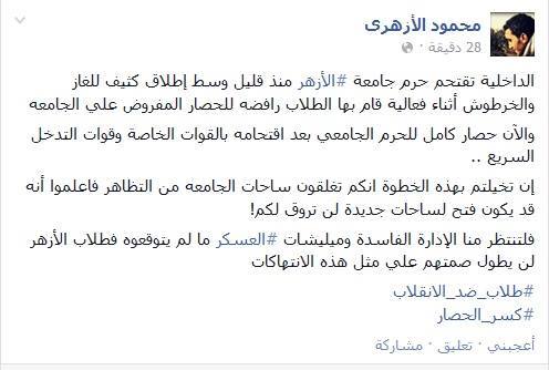 وأردف في منشوره متوعدًا إدارة الجامعة: "فلتنتظر منا الإدارة الفاسدة وميليشات العسكر ما لم يتوقعوه فطلاب الأزهر لن يطول صمتهم علي مثل هذه الانتهاكات".