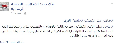 اعتدت قوات أمن الانقلاب على طالبة بالضرب بالأقدام وبالعصيان على رأسها مما أدي إلي إغماءها، وحاولت الطالبات إيقافهم، لكن تم الاعتداء عليهن بالضرب أيضًا، ما نتج عنه إصابات بين الطالبات، بحسب الصفحة الرسمية لحركة طلاب ضد الانقلاب.