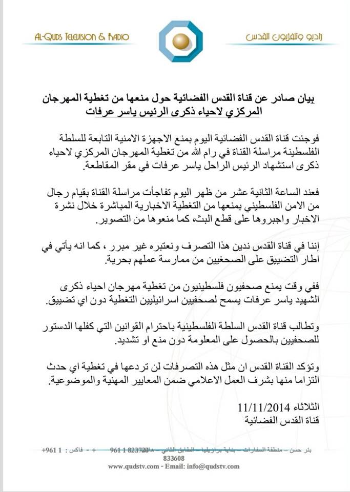 وقالت القناة في البيان: "فوجئت قناة القدس الفضائية، اليوم، بمنع الأجهزة الأمنية التابعة للسلطة الفلسطينية مراسلة القناة في رام الله من تغطية المهرجان المركزي لإحياء ذكرى استشهاد الرئيس الراحل ياسر عرفات في مقر المقاطعة".