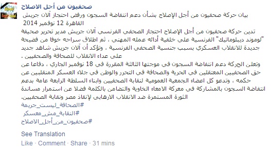 أدانت "حركة صحفيون من أجل الإصلاح" احتجاز الصحفي الفرنسي آلان جريش مدير تحرير صحيفة "لوموند ديبلوماتيك" الفرنسية علي خلفية أدائه عمله المهني، ثم إطلاق سراحه خوفًا من فضيحة جديدة للانقلاب العسكري بسبب جنسية الصحفي الفرنسية، مؤكدة أن آلان جريش شاهد جديد على عداء الانقلاب للصحافة والصحفيين.